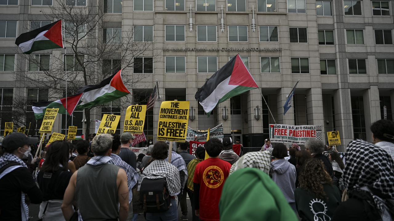 Washington DC’de göstericiler, ABD Göçmenlik ve Gümrük Muhafaza Dairesinin (ICE) binası yakınlarında bir araya geldi. Filistinli aktivist Halil’in tutuklanmasını protesto…